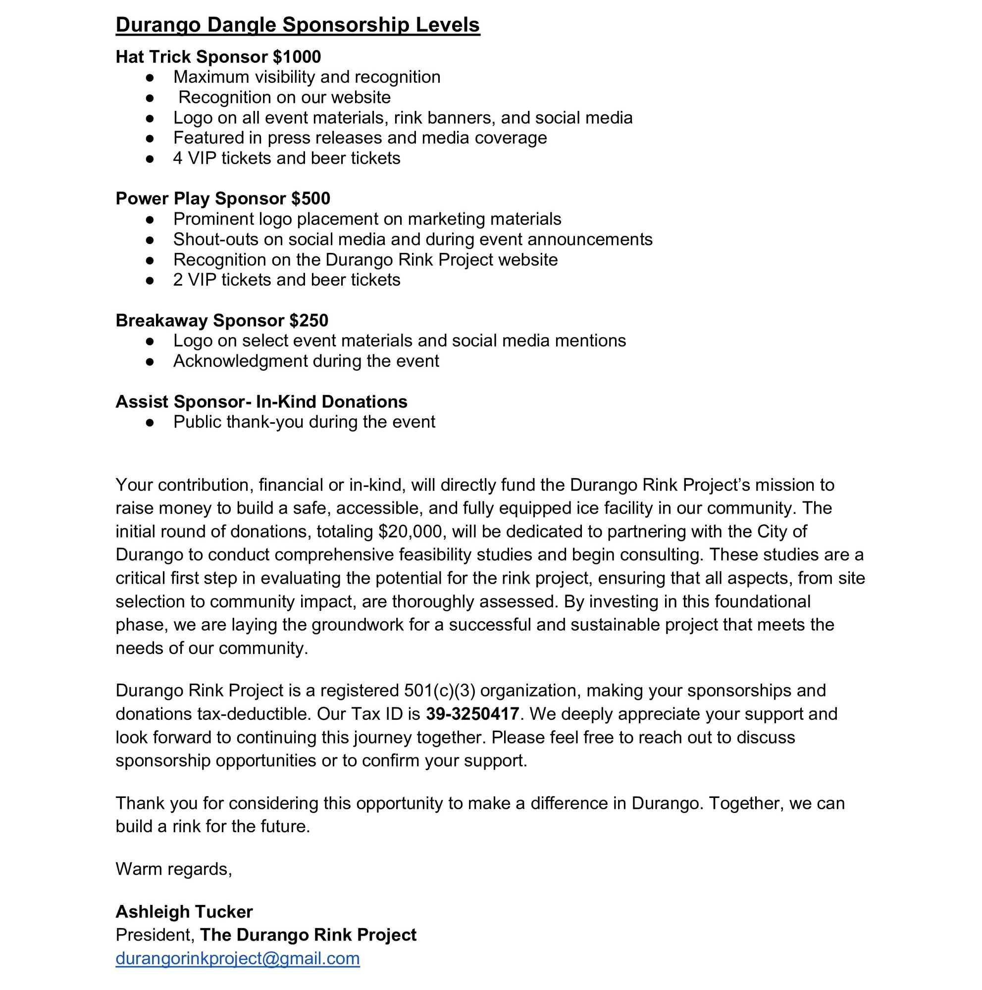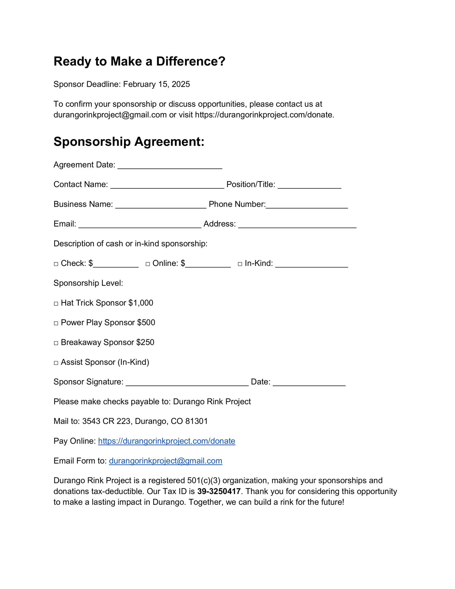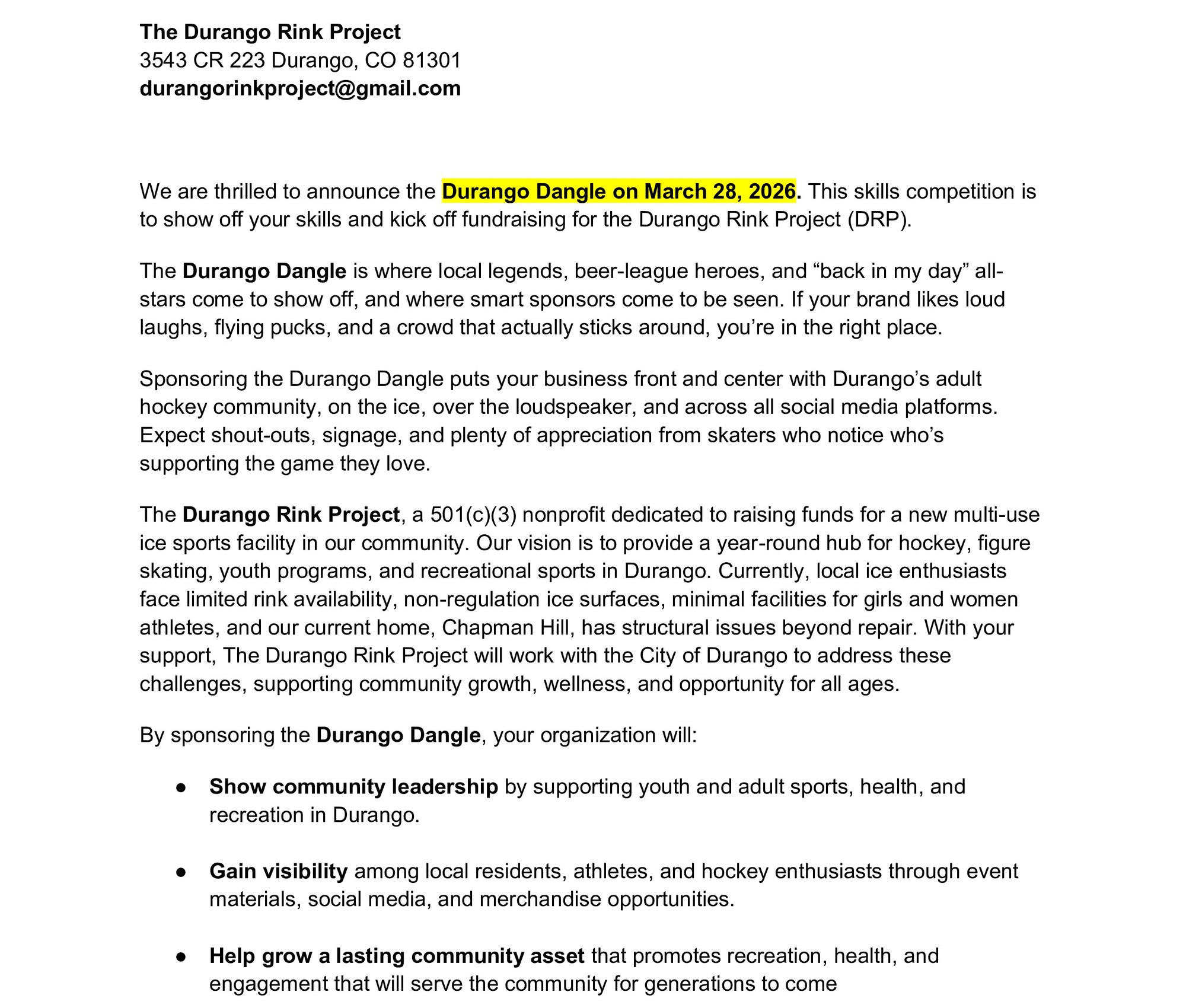 The Durango Rink Project (DRP) is dedicated to bringing the community together to develop a state-of-the-art sports complex that will feature two sheets of ice for the growth of ice hockey, figure skating, and learn-to-skate programs.